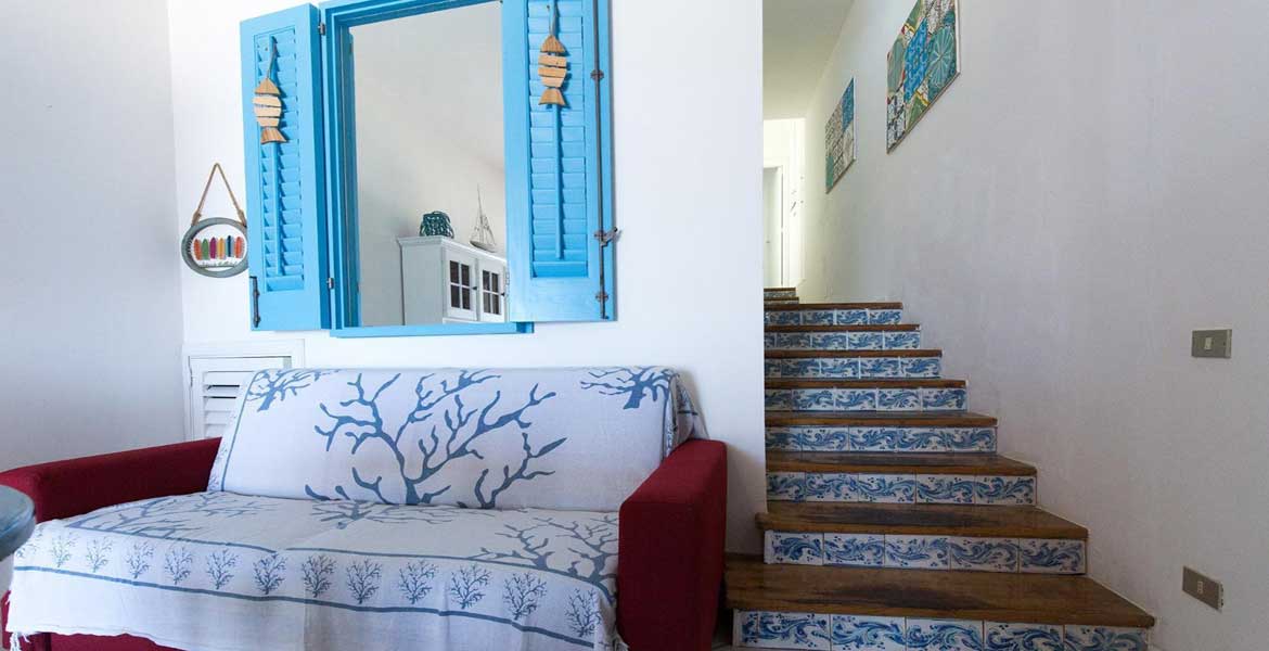 La villetta sul mare in vendita a Canneto di Lipari, Casa Angela, internamente disposta su più livelli, è composta da: cucina soggiorno, camera da letto, cameretta con finestra luce, bagno completo, vano attrezzi seminterrato, pozzo luce con lavatoio, terrazza panoramica abitabile.